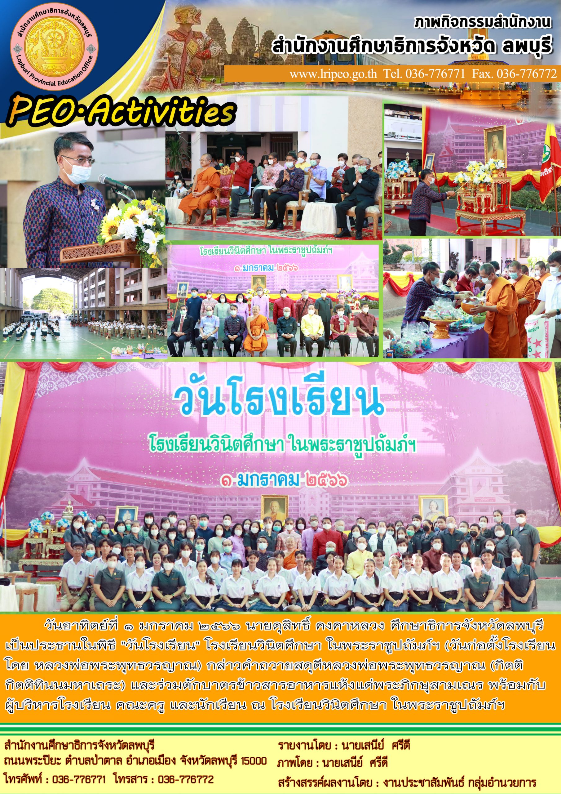 วันอาทิตย์ที่ 1 มกราคม 2566 นายดุสิทธิ์ คงคาหลวง ศึกษาธิการจังหวัดลพบุรี เป็นประธานในพิธี “วันโรงเรียน” โรงเรียนวินิตศึกษา ในพระราชูปถัมภ์ฯ (วันก่อตั้งโรงเรียน โดย หลวงพ่อพระพุทธวรญาณ) กล่าวคำถวายสดุดีหลวงพ่อพระพุทธวรญาณ(กิตติ กิตติทินนมหาเถระ) และร่วมตักบาตรข้าวสารอาหารแห้งแด่พระภิกษุสามเณร พร้อมกับผู้บริหารโรงเรียน คณะครู และนักเรียน ณ โรงเรียนวินิตศึกษา