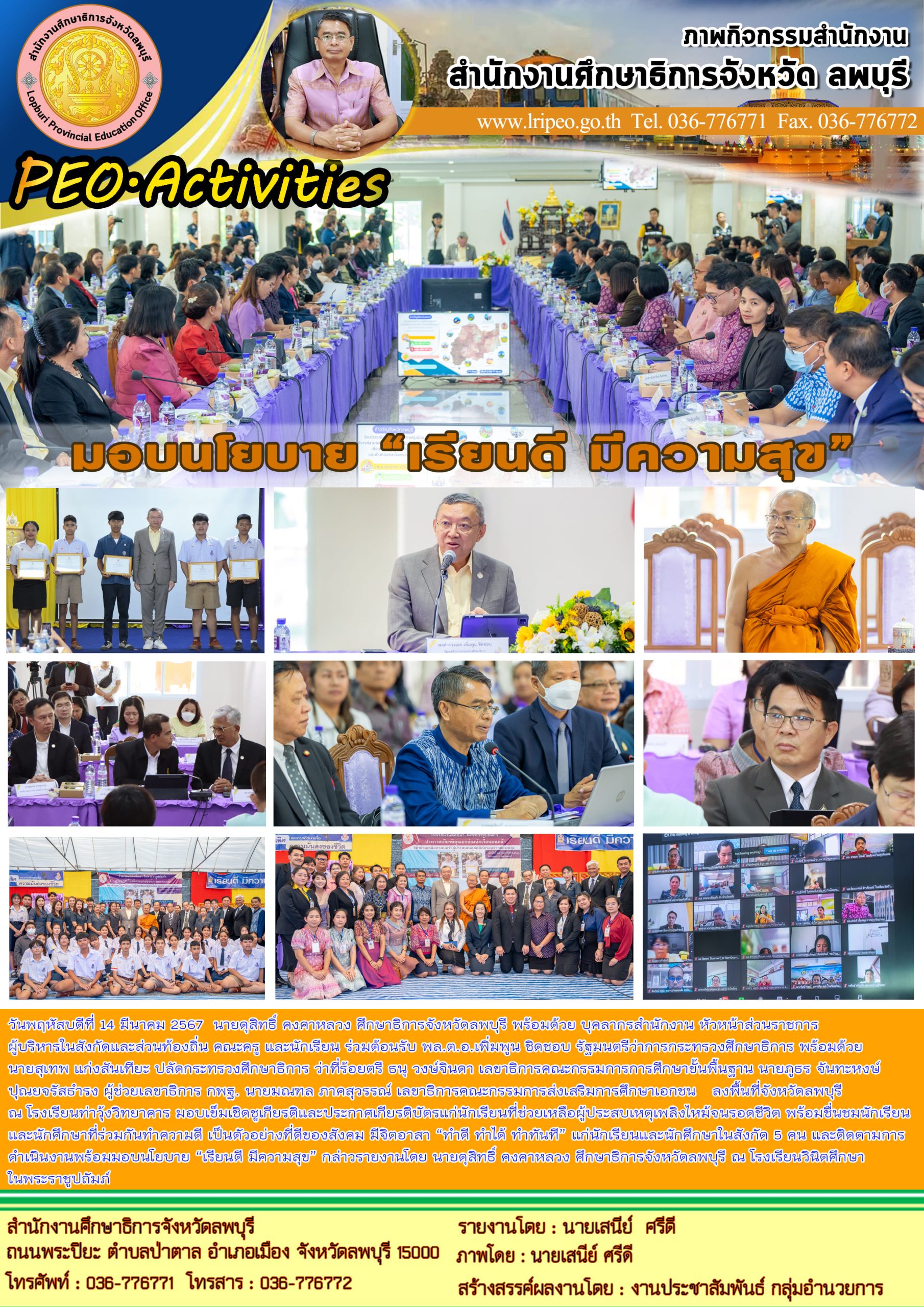 วันพฤหัสบดีที่ 14 มีนาคม 2567 นายดุสิทธิ์ คงคาหลวง ศึกษาธิการจังหวัดลพบุรี พร้อมด้วย บุคลากรสำนักงาน หัวหน้าส่วนราชการ ผู้บริหารในสังกัดและส่วนท้องถิ่น คณะครู และนักเรียน ร่วมต้อนรับ พล.ต.อ.เพิ่มพูน ชิดชอบ รัฐมนตรีว่าการกระทรวงศึกษาธิการ พร้อมด้วยนายสุเทพ แก่งสันเทียะ ปลัดกระทรวงศึกษาธิการ ว่าที่ร้อยตรี ธนุ วงษ์จินดา เลขาธิการคณะกรรมการการศึกษาขั้นพื้นฐาน นายภูธร จันทะหงษ์ ปุณยจรัสธำรง ผู้ช่วยเลขาธิการ กพฐ. นายมณฑล ภาคสุวรรณ์ เลขาธิการคณะกรรมการส่งเสริมการศึกษาเอกชน ลงพื้นที่จังหวัดลพบุรี ณ โรงเรียนท่าวุ้งวิทยาคาร มอบเข็มเชิดชูเกียรติและประกาศเกียรติบัตรแก่นักเรียนที่ช่วยเหลือผู้ประสบเหตุเพลิงไหม้จนรอดชีวิต พร้อมชื่นชมนักเรียนและนักศึกษาที่ร่วมกันทำความดี เป็นตัวอย่างที่ดีของสังคม มีจิตอาสา “ทำดี ทำได้ ทำทันที” แก่นักเรียนและนักศึกษาในสังกัด 5 คน
