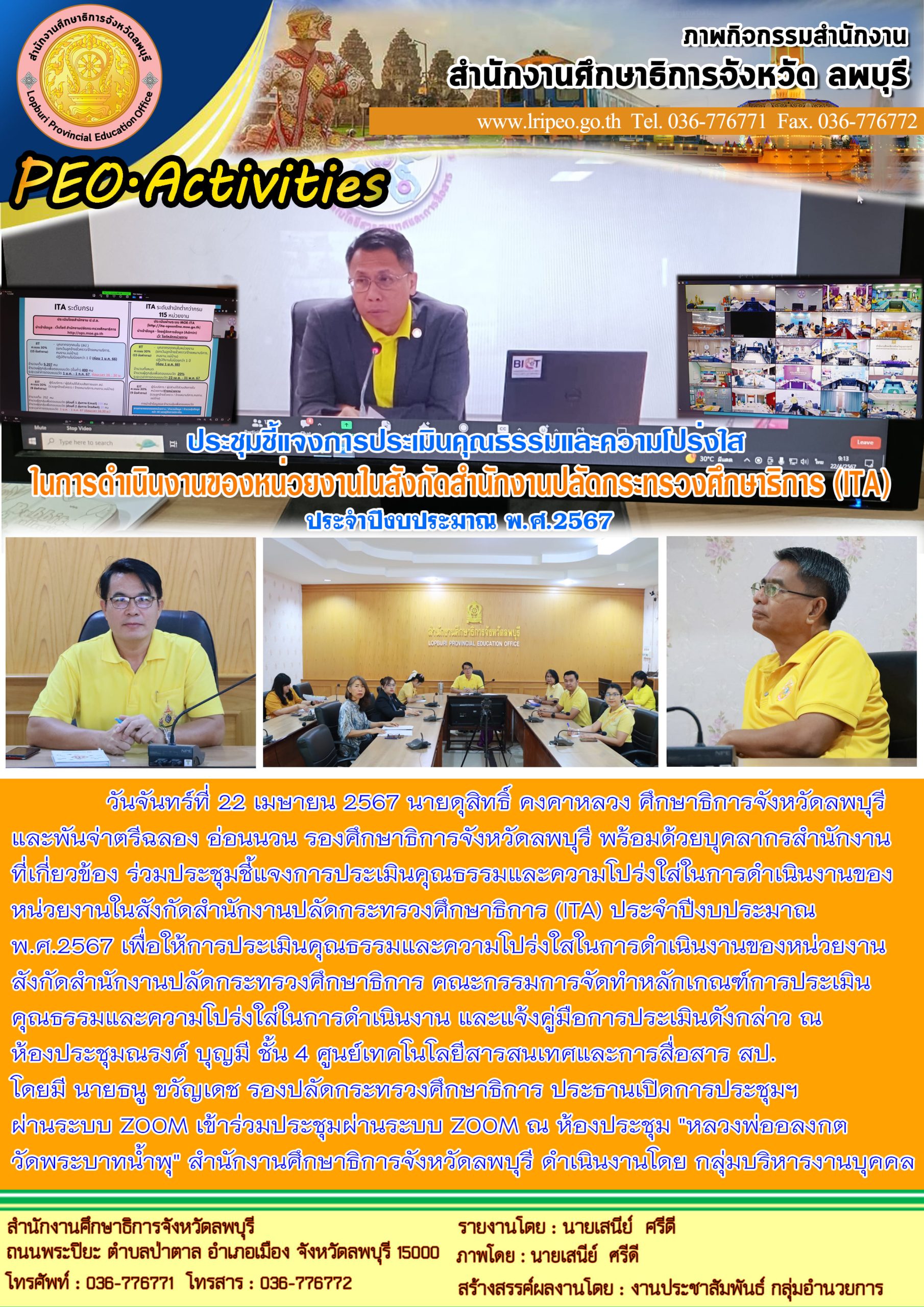 วันจันทร์ที่ 22 เมษายน 2567 นายดุสิทธิ์ คงคาหลวง ศึกษาธิการจังหวัดลพบุรี และพันจ่าตรีฉลอง อ่อนนวน รองศึกษาธิการจังหวัดลพบุรี พร้อมด้วยบุคลากรสำนักงานที่เกี่ยวข้อง ร่วมประชุมชี้แจงการประเมินคุณธรรมและความโปร่งใสในการดำเนินงานของหน่วยงานในสังกัดสำนักงานปลัดกระทรวงศึกษาธิการ (ITA) ประจำปีงบประมาณ พ.ศ.2567 เพื่อให้การประเมินคุณธรรมและความโปร่งใสในการดำเนินงานของหน่วยงานสังกัดสำนักงานปลัดกระทรวงศึกษาธิการ คณะกรรมการจัดทำหลักเกณฑ์การประเมินคุณธรรมและความโปร่งใส่ในการดำเนินงาน และแจ้งคู่มือการประเมินดังกล่าว ณ ห้องประชุมณรงค์ บุญมี ชั้น 4 ศูนย์เทคโนโลยีสารสนเทศและการสื่อสาร สป. โดยมี นายธนู ขวัญเดช รองปลัดกระทรวงศึกษาธิการ ประธานการประชุมฯ ผ่านระบบ ZOOM เข้าร่วมประชุมผ่านระบบ ZOOM ณ ห้องประชุม “หลวงพ่ออลงกต