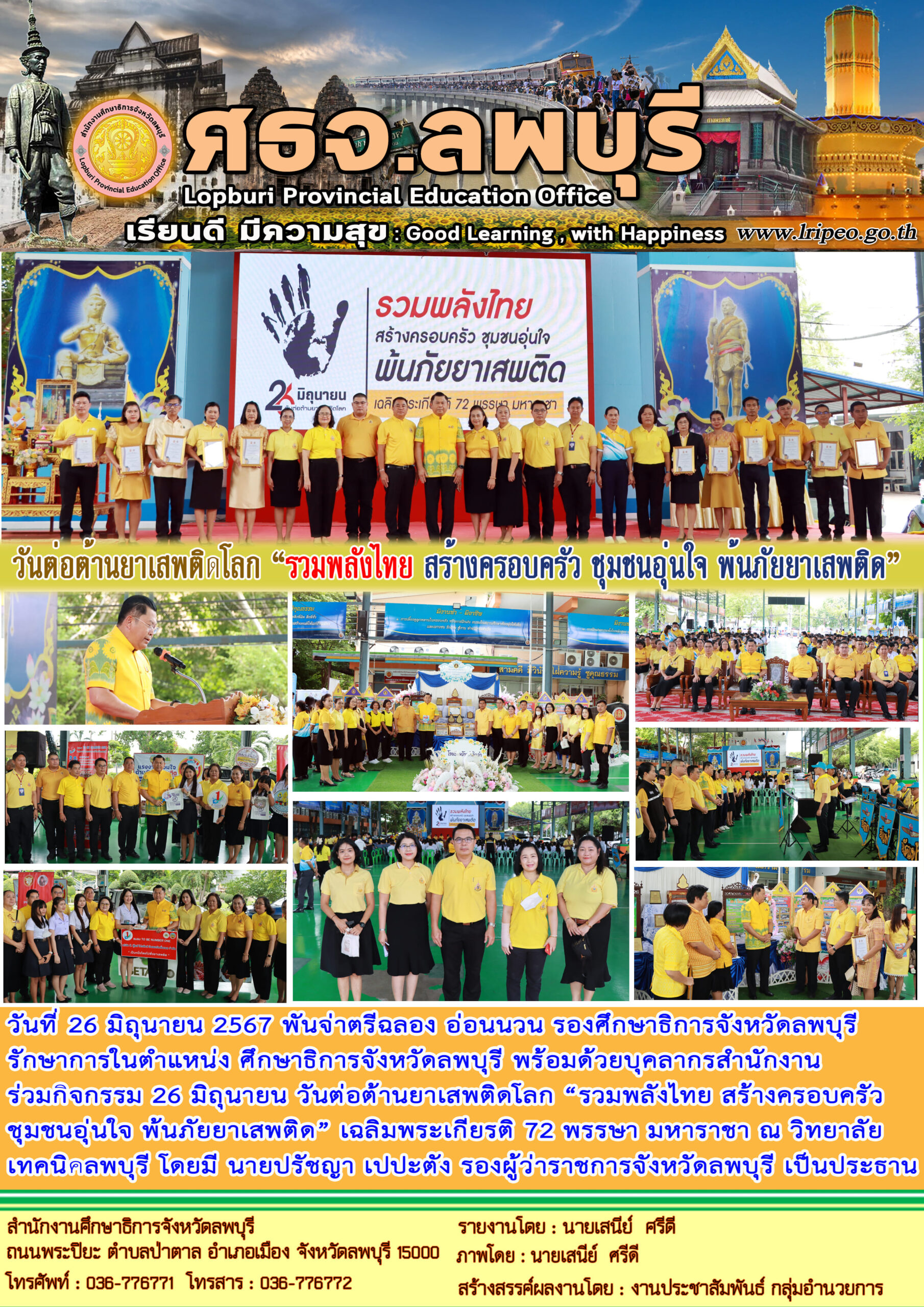 26 มิถุนายน วันต่อต้านยาเสพติดโลก “รวมพลังไทย สร้างครอบครัว ชุมชนอุ่นใจ พ้นภัยยาเสพติด” เฉลิมพระเกียรติ 72 พรรษา มหาราชา ณ วิทยาลัยเทคนิคลพบุรี
